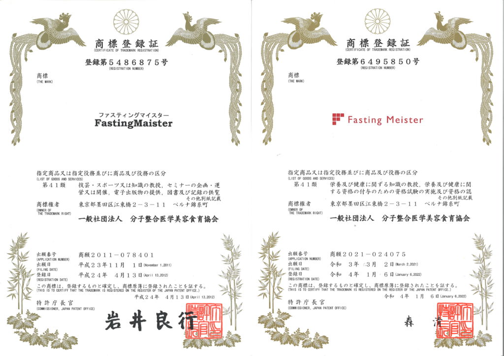 当協会が使用している「ファスティングマイスター」の名称は、2012年4月13日に第41類で正式に商標登録(登録第5486875号)したものであり、2022年にはロゴ入りで再登録(登録第6495850号)済です。以降、継続的に教育・認定活動において使用しております。